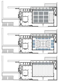 La notevole mole fisica del palazzo dello sport è attenuata dalla composizione per strati orizzontali; una grande “aula” flessibile e allestibile per altre manifestazioni ed eventi. Il museo dello sport, propone la possibilità di realizzare un percorso museale attorno ad un patio interno che modula la luce naturale. La piazza sopraelevata, enfatizzata dalla gradinata di raccordo con la strada e il parcheggio, è legata alla fruizione del museo ma diventa una terrazza panoramica sullo stadio e sul parco riparata e sovrastata dai Cedri esistenti; un luogo di sosta e di incontro collegato anche esternamente al giardino sottostante.