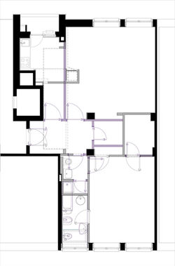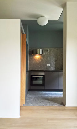 Casa M., occupa il quarto piano di un edificio di appartamenti del primi anni settanta, uno stabile borghese di edilizia aperta, in una zona semicentrale e di pregio immobiliare a Milano. Un blocco in linea compatto, privo di gerarchia nei fronti, in cui le ampie finestre inquadrano lo spazio trattato a giardino, tra i diversi blocchi residenziali rigidamente perpendicolari alla strada. La superficie dell’appartamento è di circa 90 mq. fruibili; il corridoio di distribuzione esistente, poco significativo date la ridotta profondità dello spazio a disposizione, viene eliminato a favore del massimo ampliamento della zona giorno. Un volume in muratura accoglie e delimita la cucina aperta, diventandone il fulcro della trasformazione, con l’obiettivo di disciplinarne e articolarne contemporaneamente lo spazio interno, compensando quanto possibile la durezza dell'architettura dell'edificio, priva di elementi di mediazione con l'esterno.