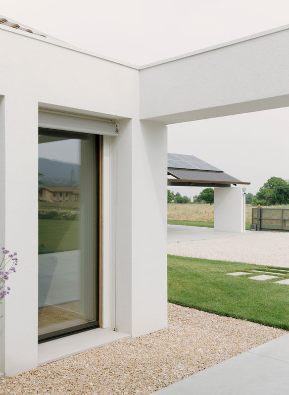 Lungo la direttrice nord-ovest del territorio posto tra Vicenza e Schio nel comune di San Vito di Leguzzano, la costruzione di questa casa si inserisce in un tipico contesto di piccola espansione suburbana povero di tensioni e di un chiaro statuto dal punto di vista paesaggistico e morfologico. L’intervento è situato all’interno di un ampio lotto dallo sviluppo in profondità, che si apre verso sud-est in un ambito agricolo faticosamente salvaguardato dall’intenso sviluppo che questo territorio ha subito e ormai stabilizzato.